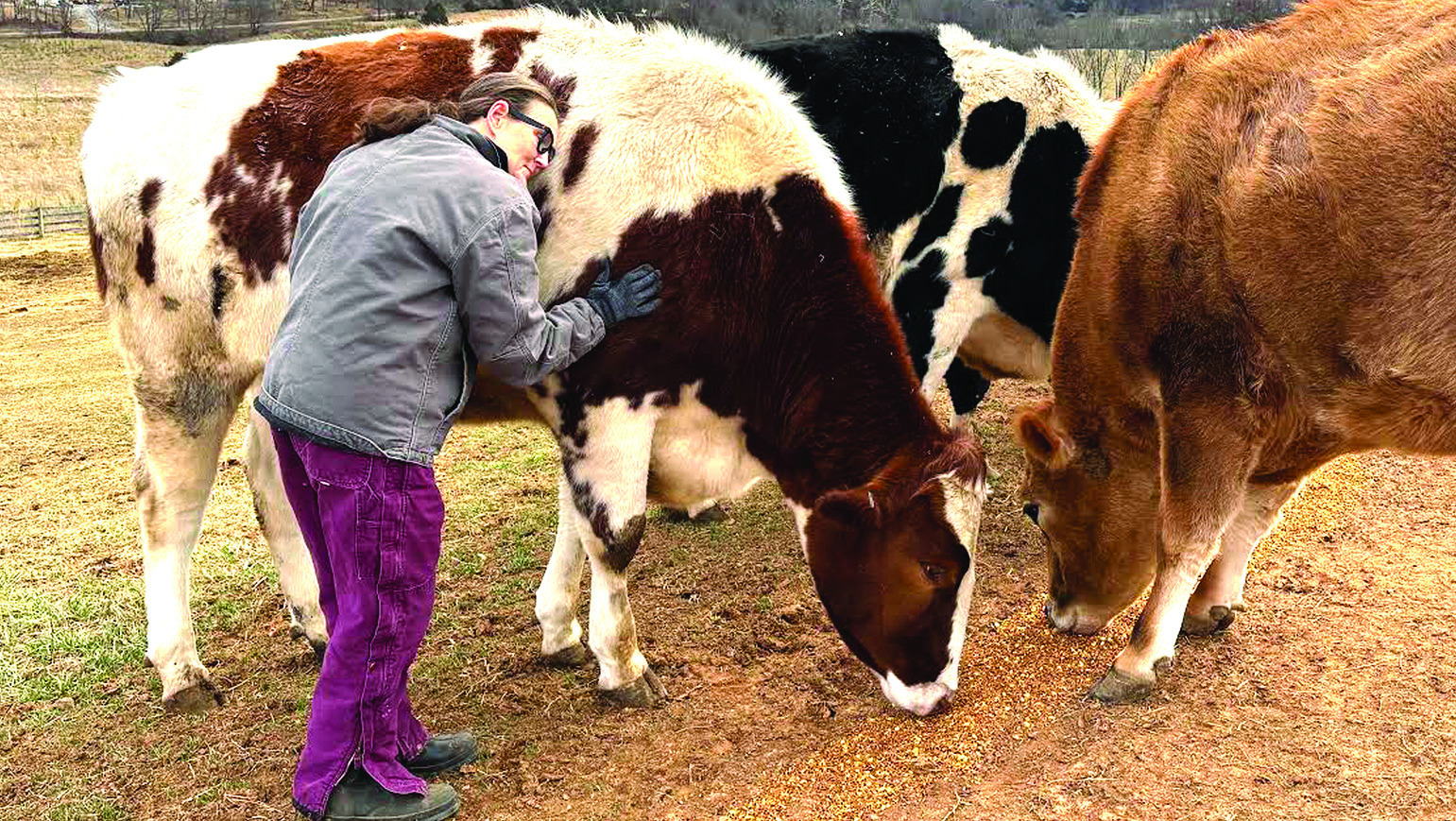 GENTLE ACRES Farm Haven owner and Founder Jeanine Wittlinger hugs Red, one of the many cows at the sanctuary, during their afternoon feeding time. (Ava Tallat-Kelpsa photo)