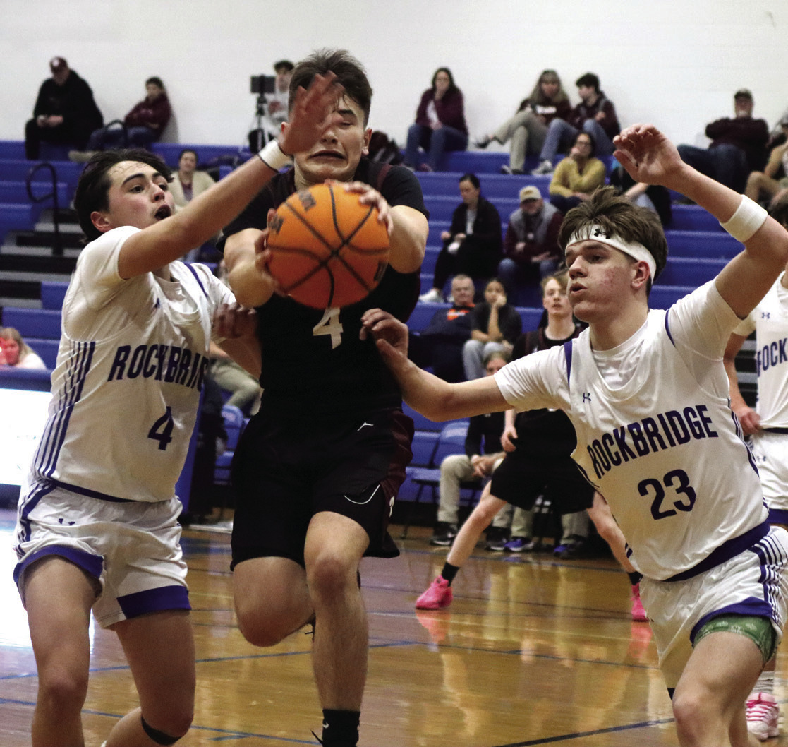 ABOVE, Stuarts Draft’s Kabren Garrett holds onto the ball while RC junior guards Brayden Camden (left) and Christian Moore (23) surround him and RC junior forward Brenden Staley (1) watches. AT UPPER LEFT, Moore (far right) guards Stuarts Draft’s Brogan Fitzgerald (24) closely while other Draft players try to get open. AT LOWER LEFT, Staley holds onto the ball while junior teammate Johnathan Soriano Caceres stays close as two Cougars pressure Staley. Watching are RC junior guard Bradi Ziegler (5) and Moore. (Stephanie Mikels Blevins photos)
