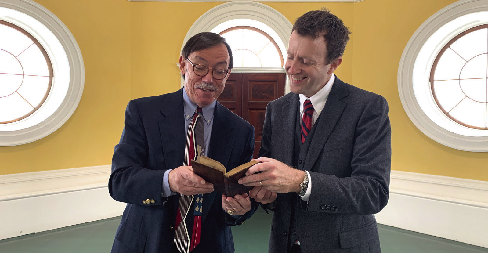 W&L’s TOM CAMDEN and Brian Alexander, in the Dome Room of Monticello, examine Leyburn Library’s annotated copy of Jefferson’s Manual. The two presented the book to scholars at Monticello’s International Center for Jefferson Studies in 2019, where Alexander was later a research fellow. (photo courtesy of Thomas Jefferson Foundation)