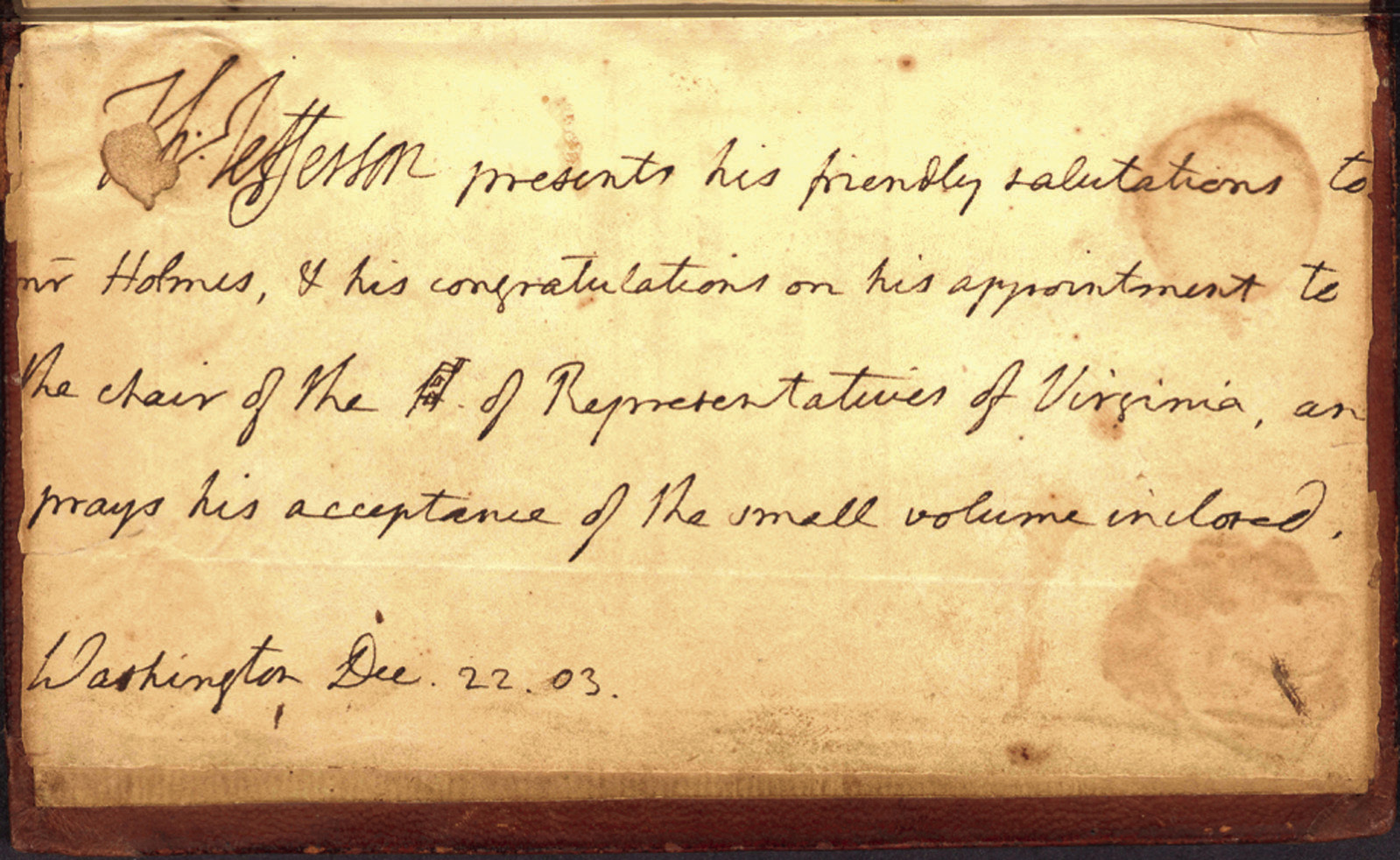 A LETTER from Thomas Jefferson is pasted into the W&L copy of his Manual, presenting the book to Hugh Holmes, speaker of the Virginia House of Representatives. In the abbreviated “H” for “House,” it appears that Jefferson drew a figure of a tiny house, with a chimney. (photo courtesy of W&L Special Collections)