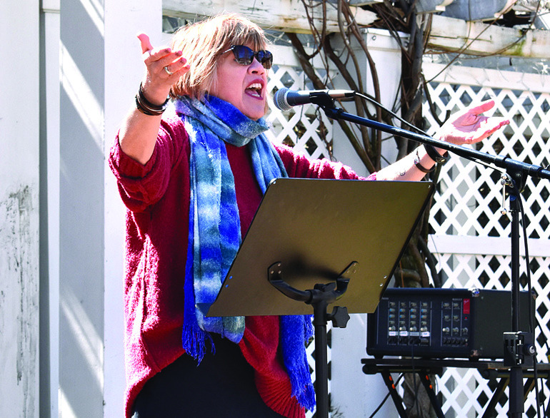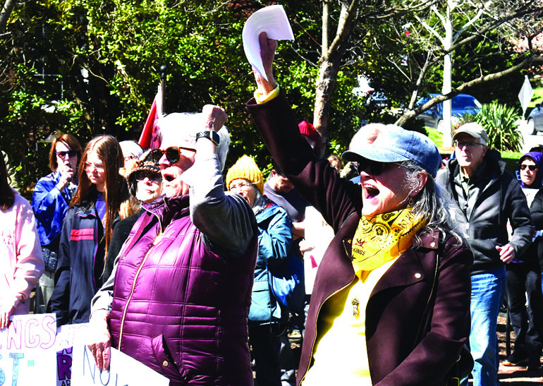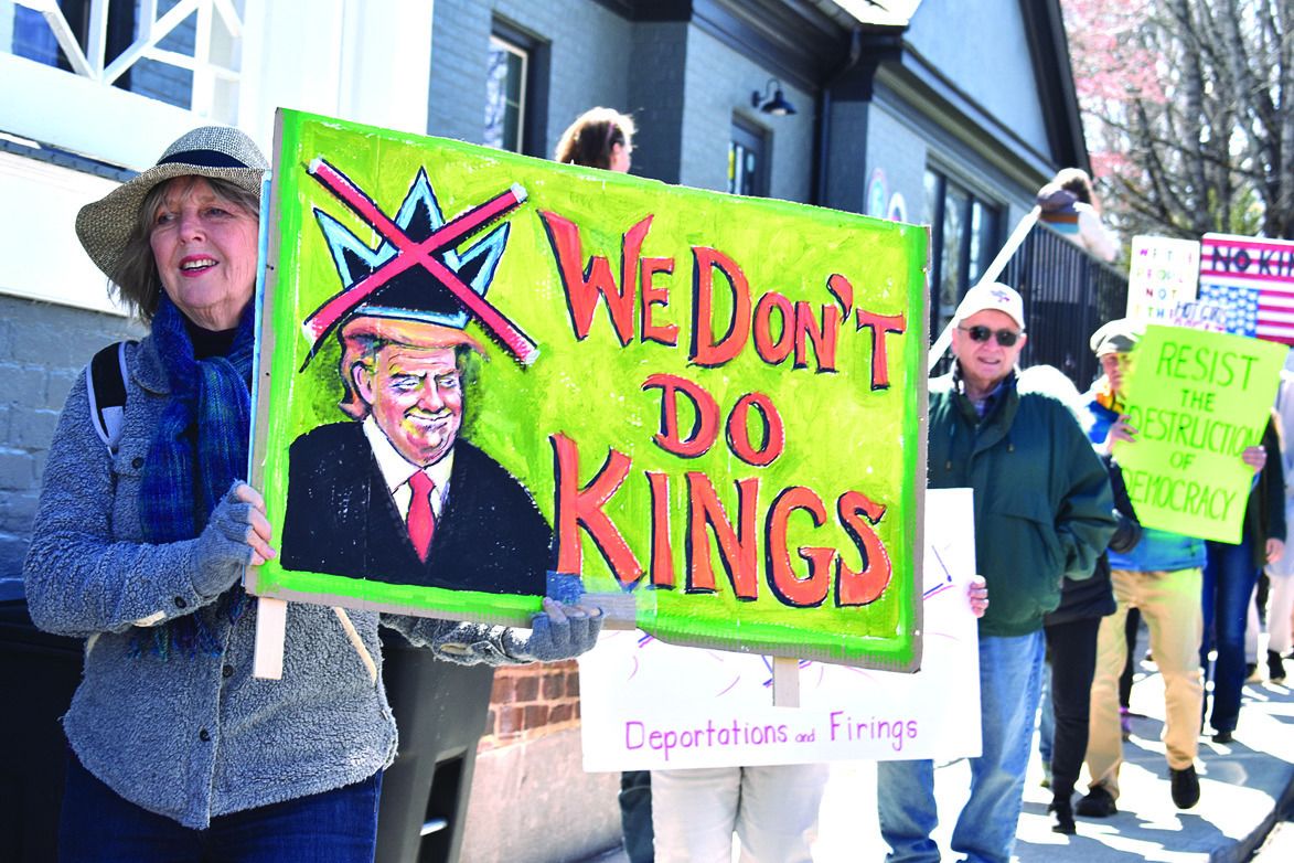 An estimated 600 people attended the No Kings rally this past Saturday in Lexington. Participants met at Oak Grove Cemetery and processed down Main Street then onto Nelson Street. The rally itself was held in Hopkins Green where there were speeches, singing and a moment of silence for the service men and women who have been killed so far in the Iran war. The rally was one of hundreds held all over the country on Saturday. This local event was organized by 50 Ways Rockbridge, the Bridge Brigade, Hearts for Democracy, the Lexington-Rockbridge-Buena Vista Democratic Committee, Maury River Friends Meeting, the Rockbridge Racial Equity Coalition and the Washington and Lee University College Democrats. (Joann Ware photos)