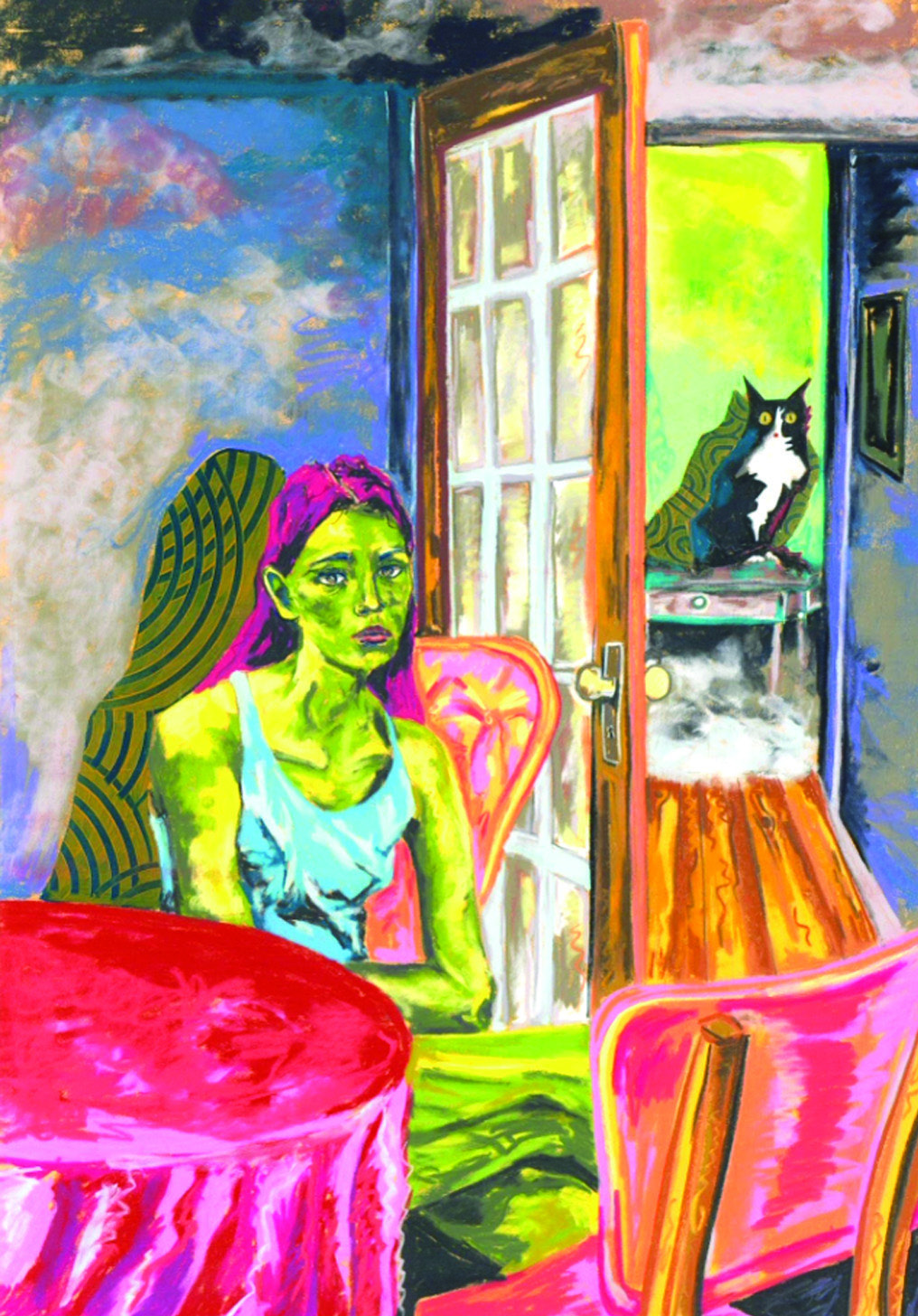 Lawson explained, “I create colorful acrylic and soft pastel paintings that use layering and textured brushwork to depict solitary figures in domestic spaces.”