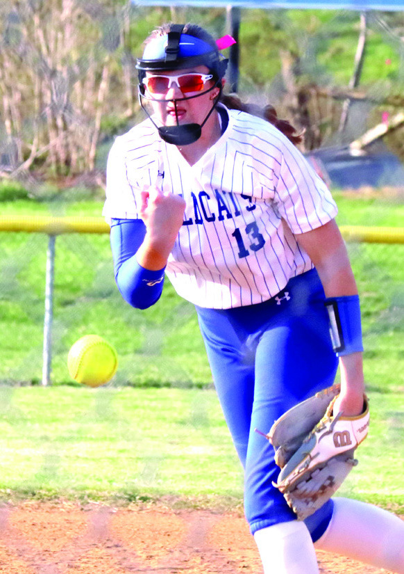 PM FRESHMAN Caroline Watts winds up before releasing a pitch. Watts pitched the first 3.2 innings, striking out two while allowing 18 hits, four walks and 17 runs. (Stephanie Mikels Blevins photo)