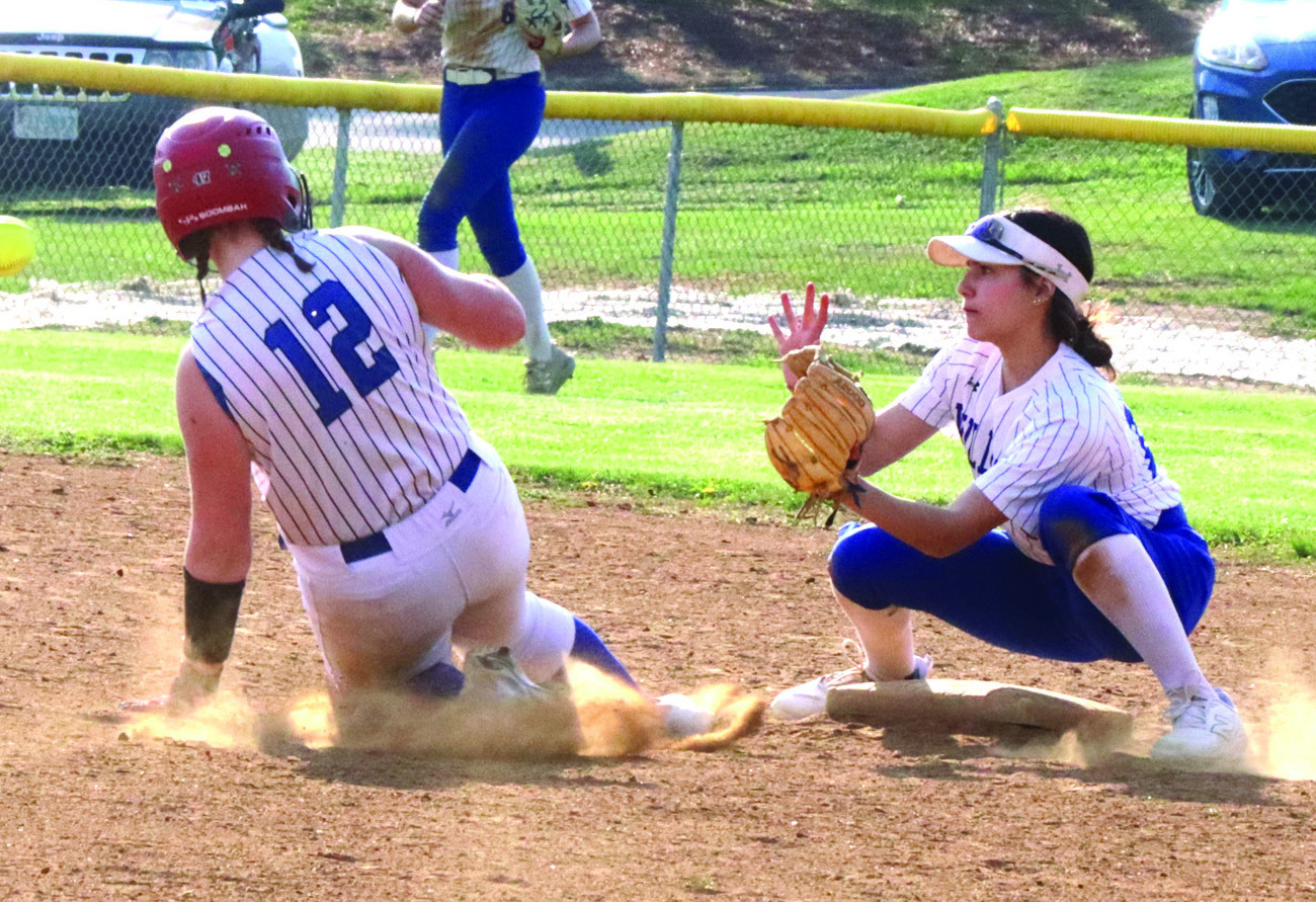 WILDCAT SENIOR shortstop Bella Dorey crouches for a catch while PM sophomore Patience Hill slides into the bag. Hill had one of the Blues’ three hits. (Stephanie Mikels Blevins photo)
