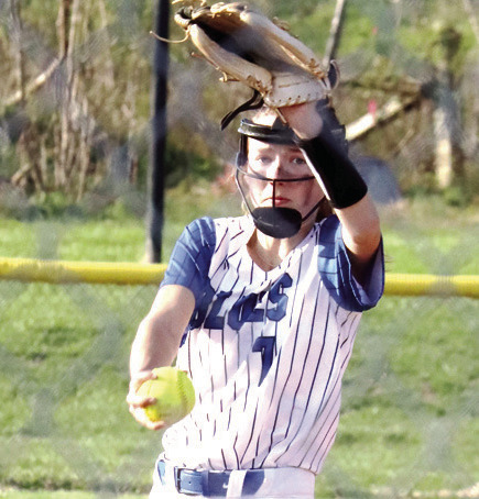 RC SENIOR Sadie Moore unleashes a pitch. Moore pitched all five innings, striking out 12 and allowing three hits and no walks in the shutout. (Stephanie Mikels Blevins photo)