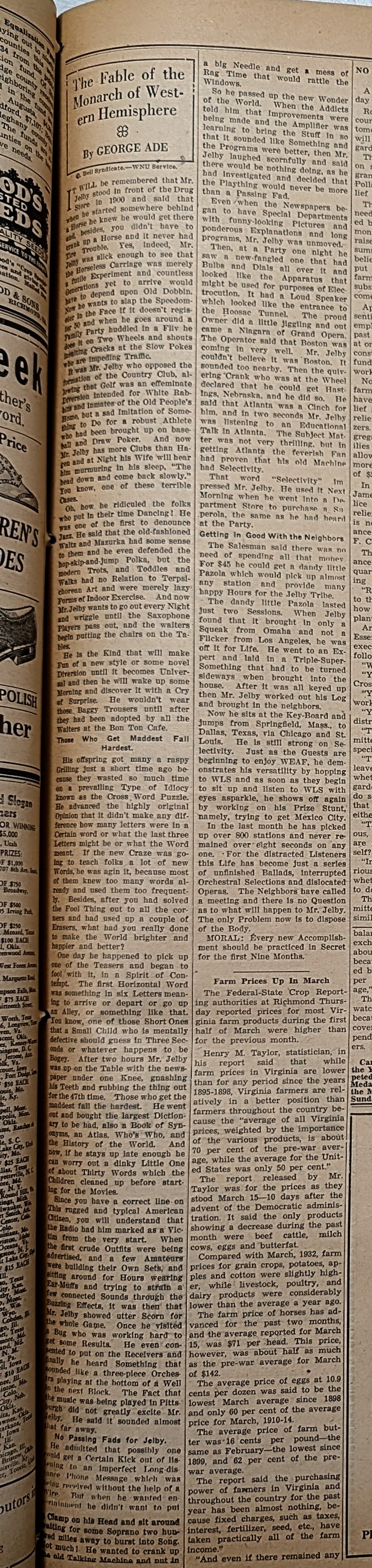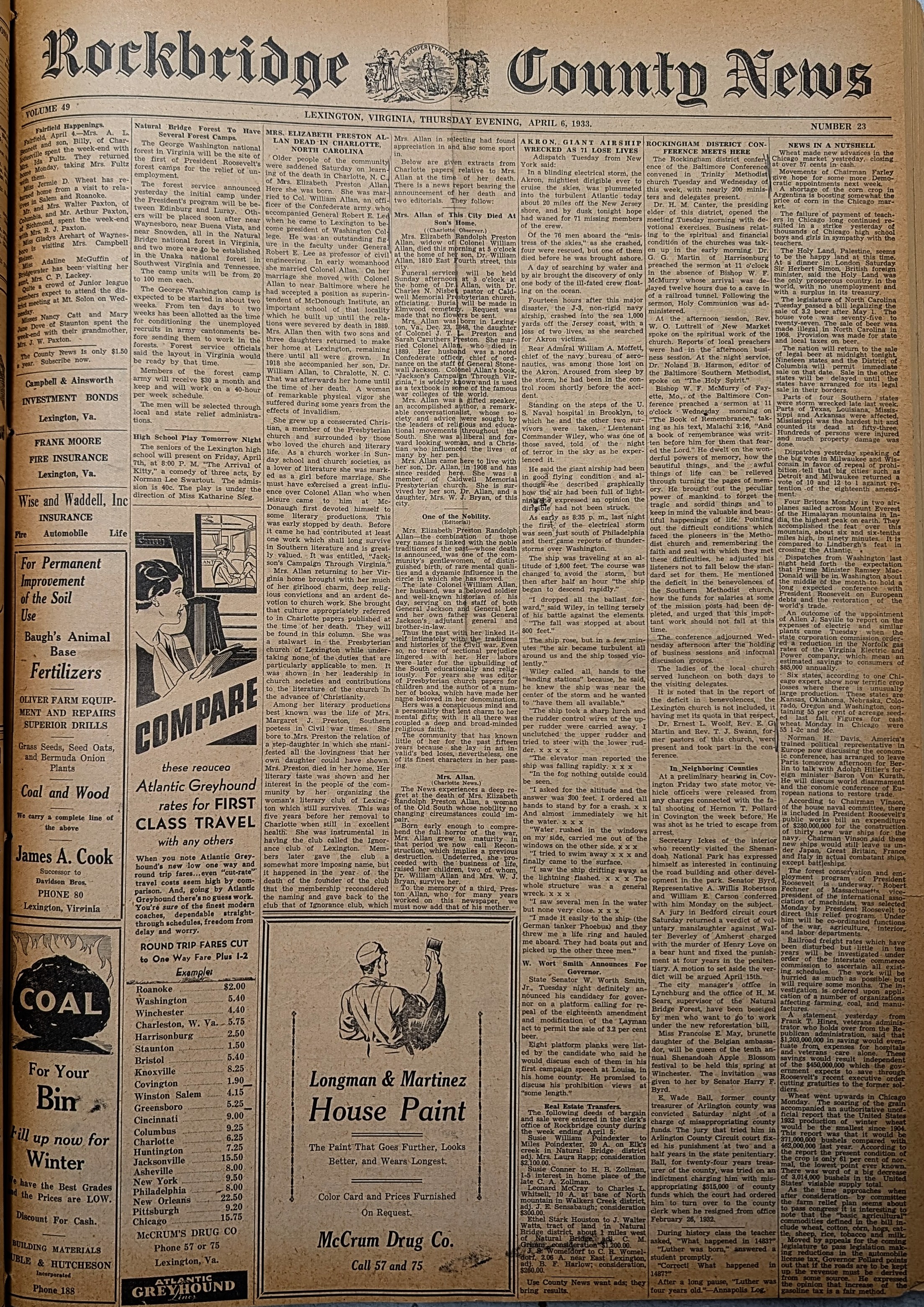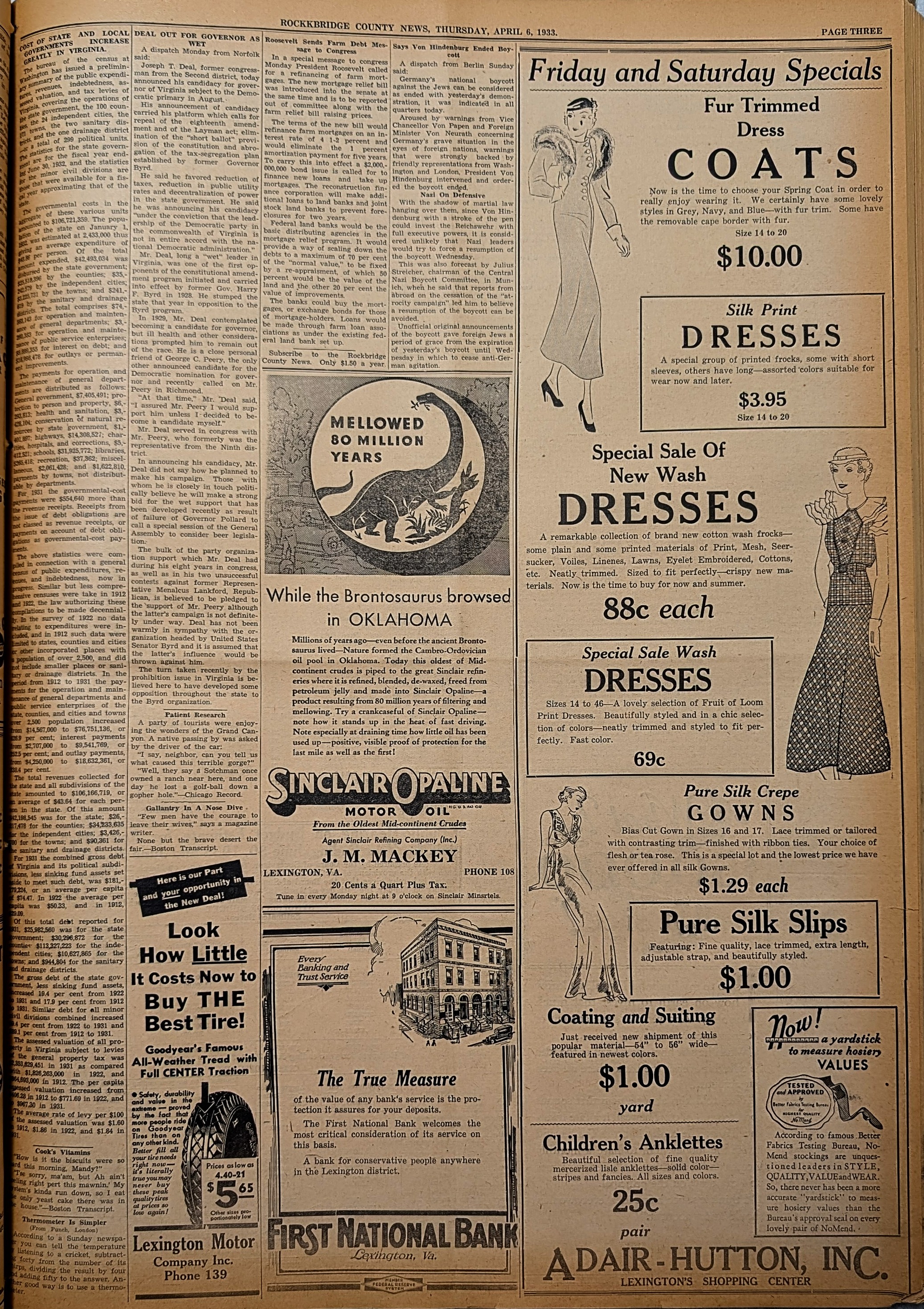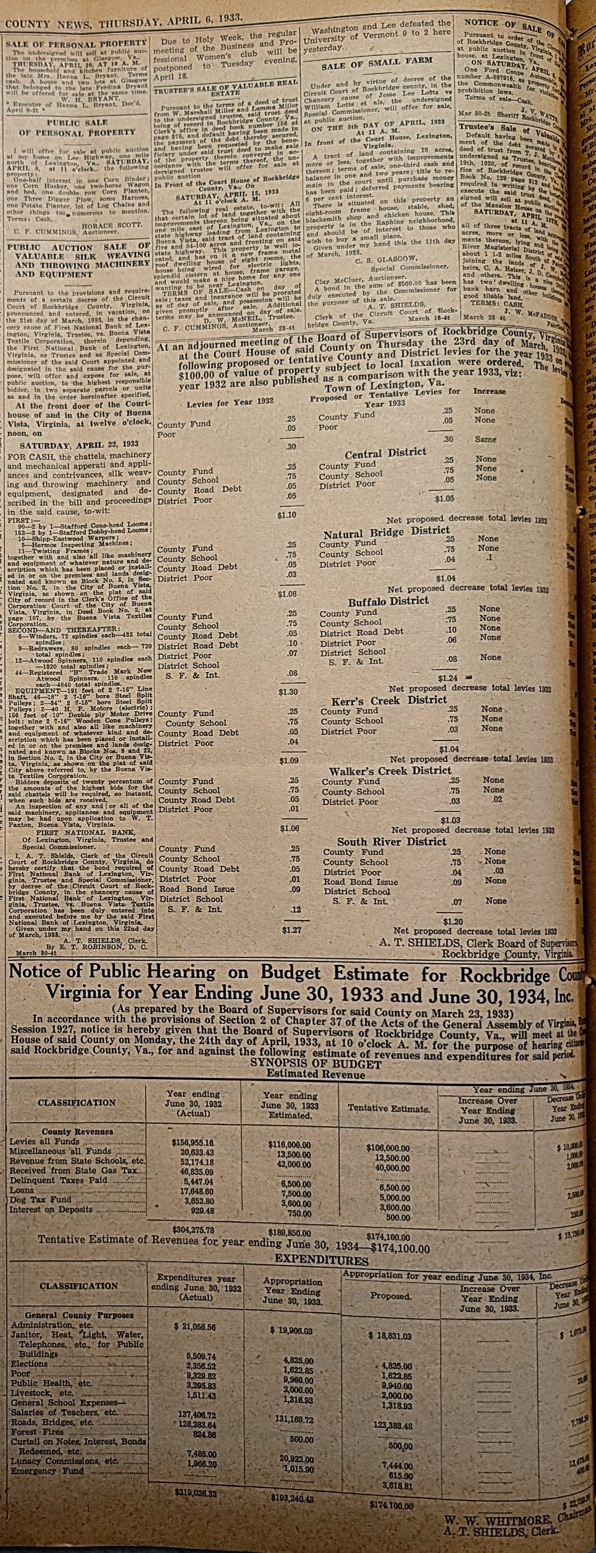 The issue of the Rockbridge County News we're looking at this week is very old and thus very brown in color: April 6, 1933.