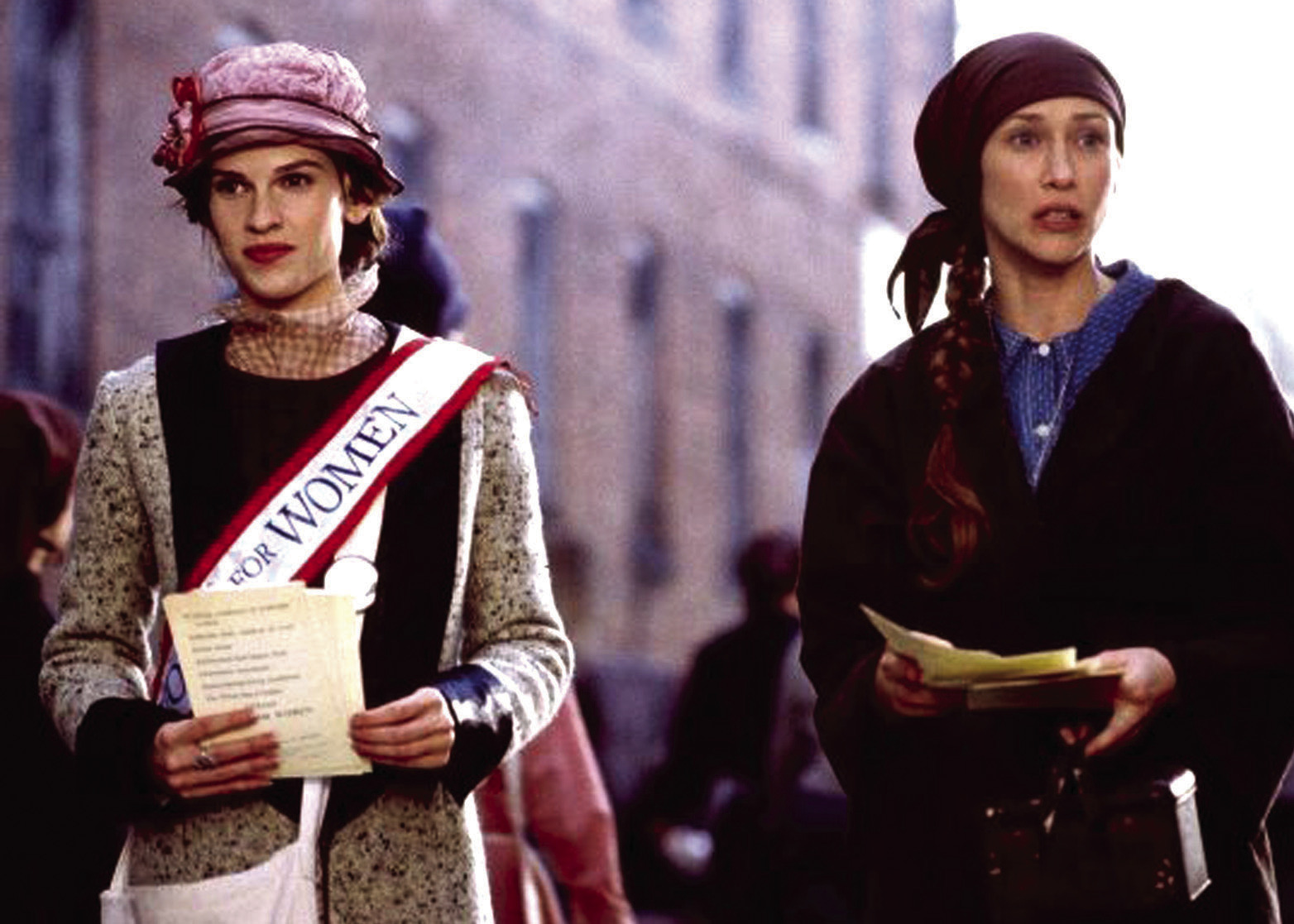 IN “IRON-JAWED ANGELS,” Hillary Swank and Frances O’Connor star as the iconic suffragettes Alice Paul and Lucy Burns. The movie will be shown on April 14 at the library.