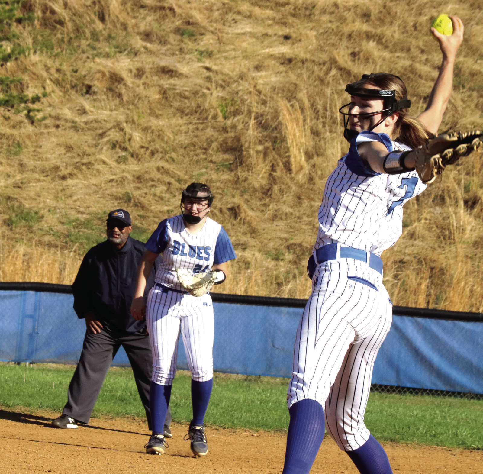 FIGHTING BLUE freshman Caroline Watts winds up before launching a pitch while junior shortstop Kendall Painter watches. Watts pitched the first two innings, striking out three while allowing two hits, three walks and five runs (one earned). (Stephanie Mikels Blevins photo)