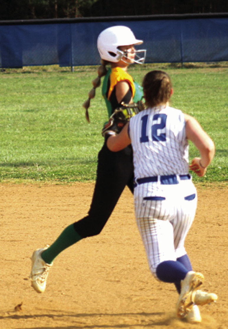 PM SOPHOMORE first baseman Patience Hill tags out a Narrows baserunner. (Ronnie Coffey photo)