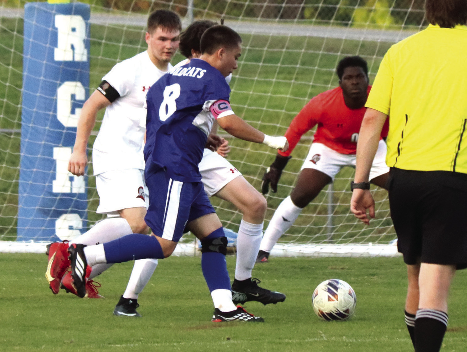 WILDCAT JUNIOR midfielder Jonathan Roy (8) goes to the ball as Riverheads goalkeeper Chris Dodson and defenders try to stop him. Roy scored RC’s final goal. (Stephanie Mikels Blevins photo)