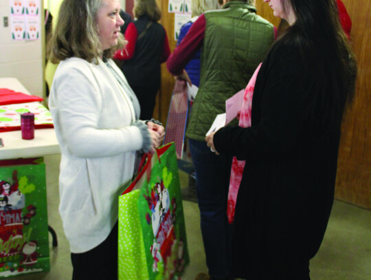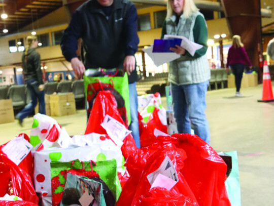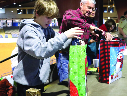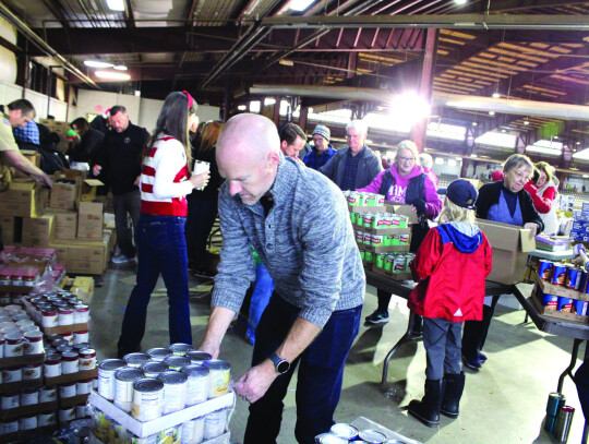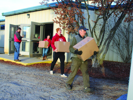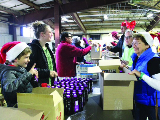 Hundreds of volunteers turned out for packing day for the Rockbridge Christmas Baskets program on Saturday morning at the Virginia Horse Center. Among those was a grandfather and grandson duo of Jim Gianniny and John Manetti (left). Providing entertainment for the busy workers was Burr Datz (left, above). Volunteers can be seen carrying boxes to delivery vehicles in the photo at below left. A total of 1,854 boxes were delivered to 3,363 children and adults this year. (all photos by Stephanie Mikels Blevins)