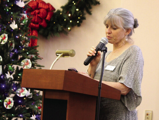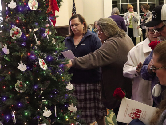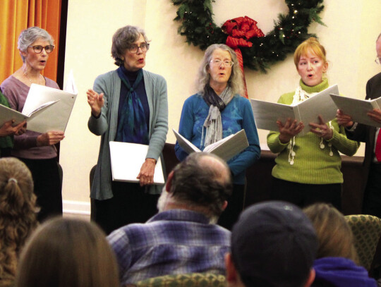 Residents gathered at Kendal on Dec. 5 for the annual Light Up A Life ceremony sponsored by ConnectionsPlus Healthcare + Hospice. Those attending were given a rose and an ornament in memory of a loved one, with the ornaments placed on a tree. Burr Datz (above), spiritual and patient care volunteer, read the names of those being remembered, and Tasha Walsh (below, right), executive director, welcomed those attending and read a poem. The Threshold Singers (right) sang “Walking Each Other Home.” (Stephanie Mikels Blevins photos)
