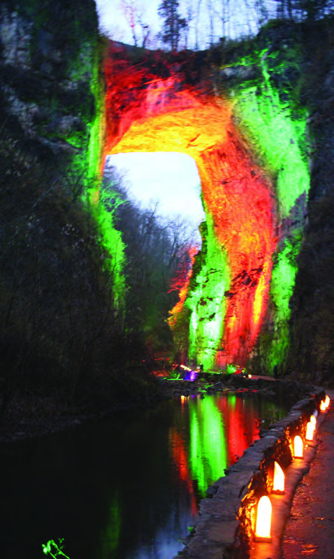 During Luminary Nights, the iconic 200-foot-tall Natural Bridge is lit from above and below by dozens of festive-colored lights, creating a breathtaking scene and an unforgettable experience for visitors of all ages.