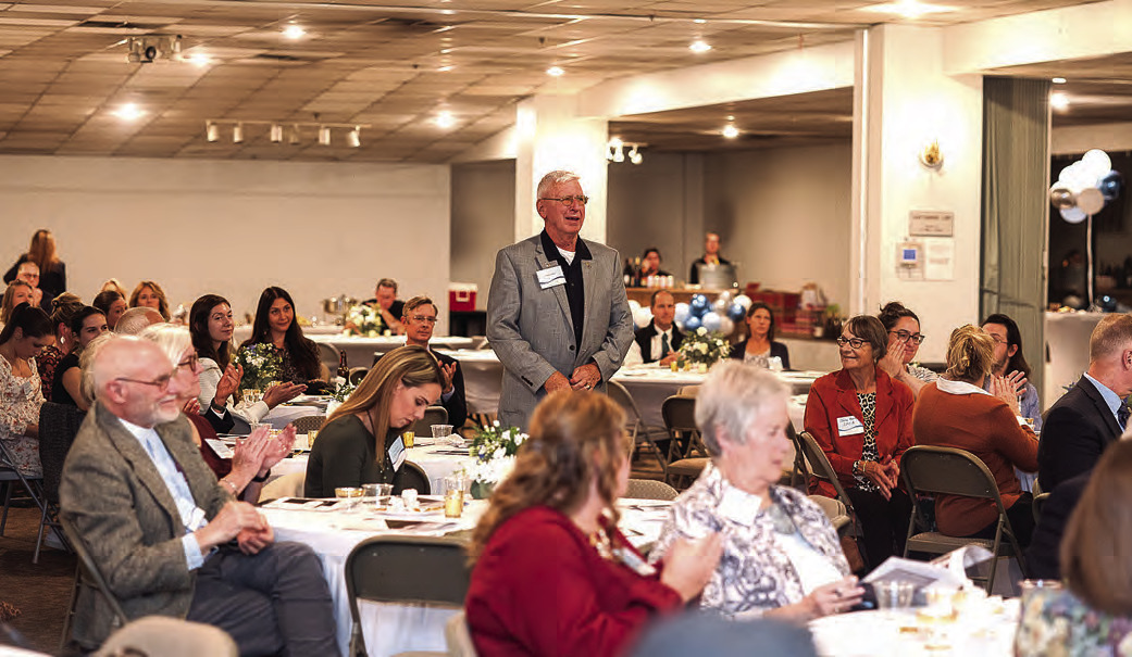 AT LEFT, Woody Salder stands as he is recognized by Executive Director Lori Turner for being the founder of the Community Foundation in 2001. ABOVE, board member Christy Harris congratulates an ARC of Rockbridge representative on their grant award, one of the many grant recipients recognized at the annual reception.