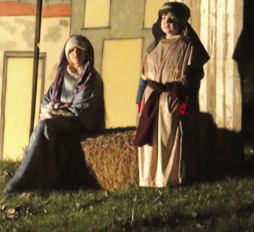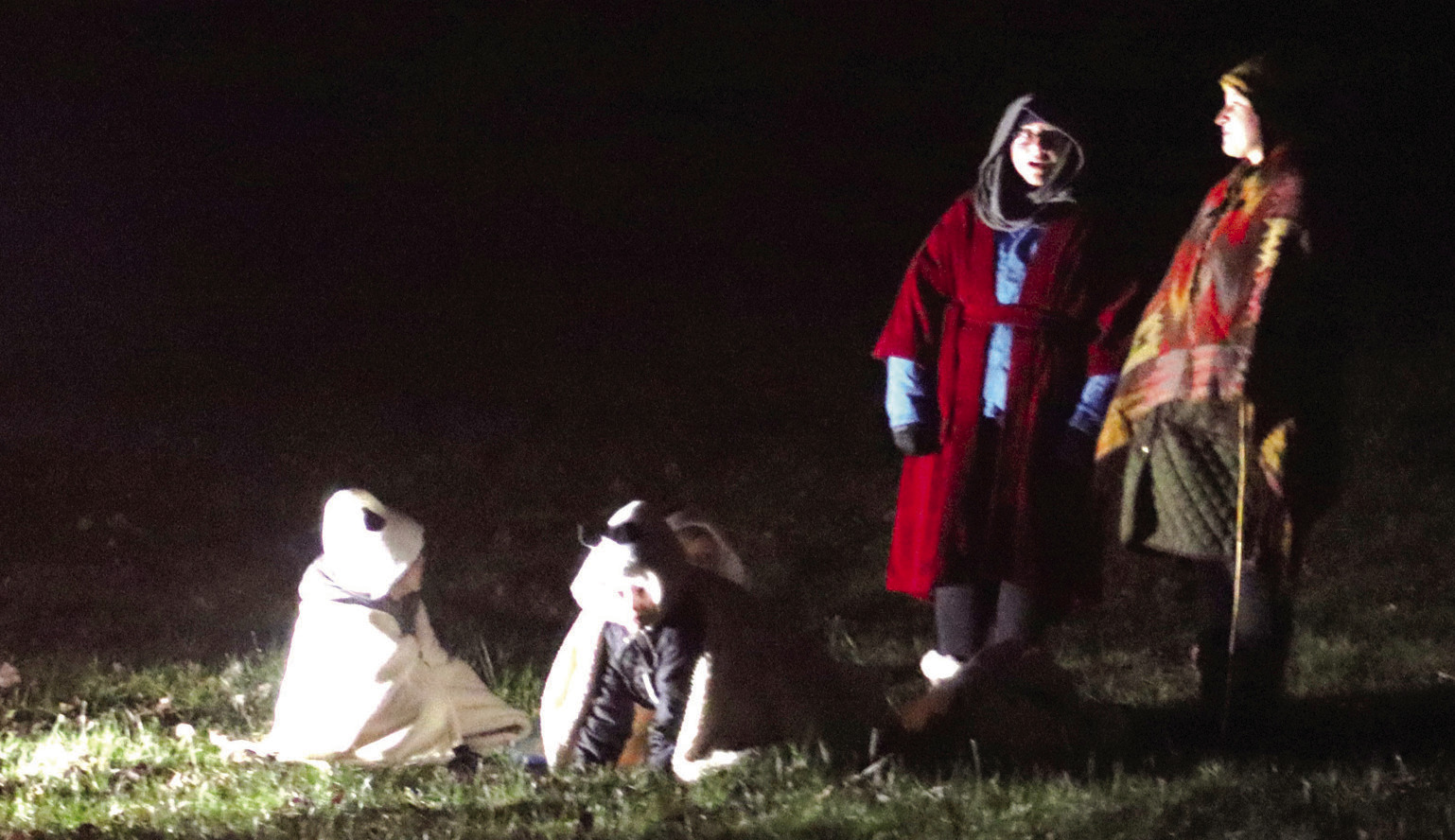 The children of High Bridge Presbyterian Church presented the live nativity “Journey to Bethlehem” Saturday evening. Among the participants were angels (above) Katherine Lotts, Caroline Lotts and Kayla Thompson; Mary and Joseph at the inn (left) played by Josee Armentrout and Colin Thompson; and sheep and shepherds (below) Everly and Kinsley Myers, Kevin Thompson and Hattie Myers and Allison Thompson. (Stephanie Mikels Blevins photos)