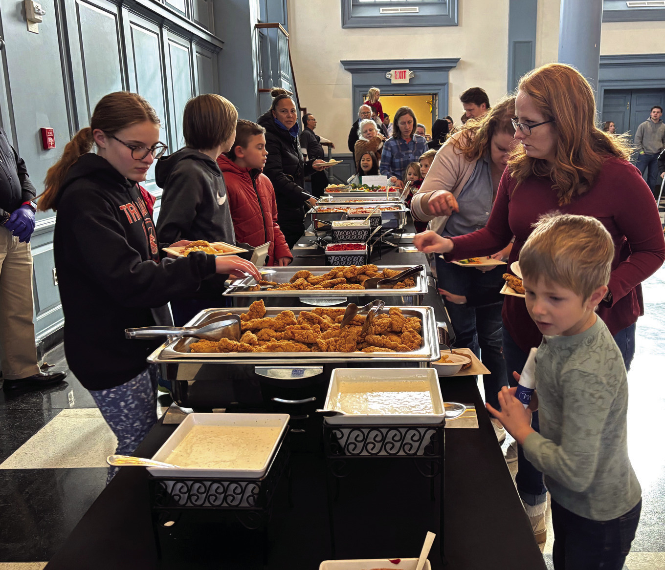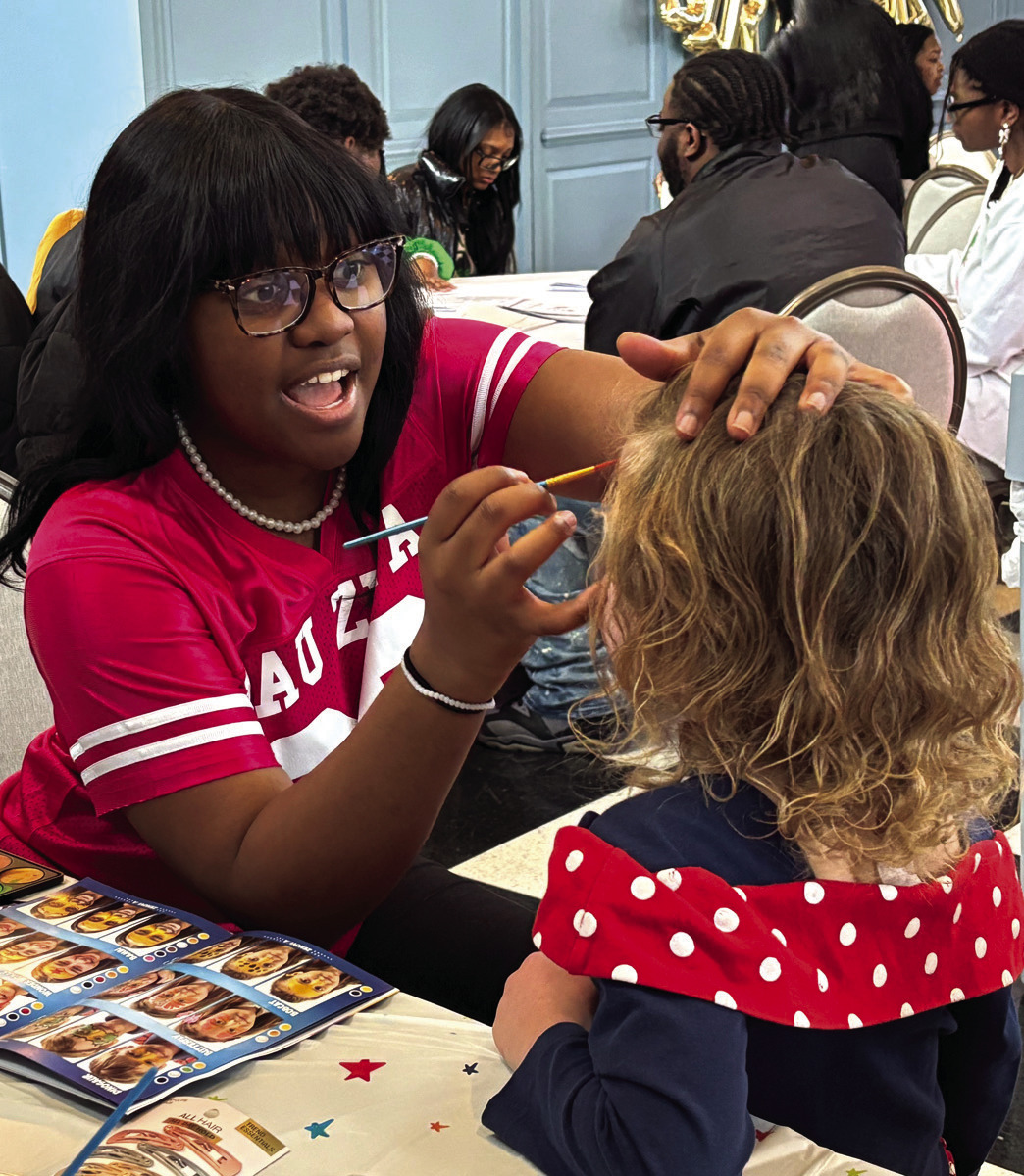 A large number of area children and their families turned out for the Dr. Martin Luther King Jr. birthday celebration at Washington and Lee University on Monday to enjoy face-painting, crafts and food. Among those painting faces were (at top right) W&L junior Laura Murambadoro talking with Frankie Kathleen Weiss. There were also CARE Rockbridge “Reading in Color” sessions with W&L students, including Bemnet Ali and Atiba De Souza (above), reading to the students. (Mary Woodson photos)